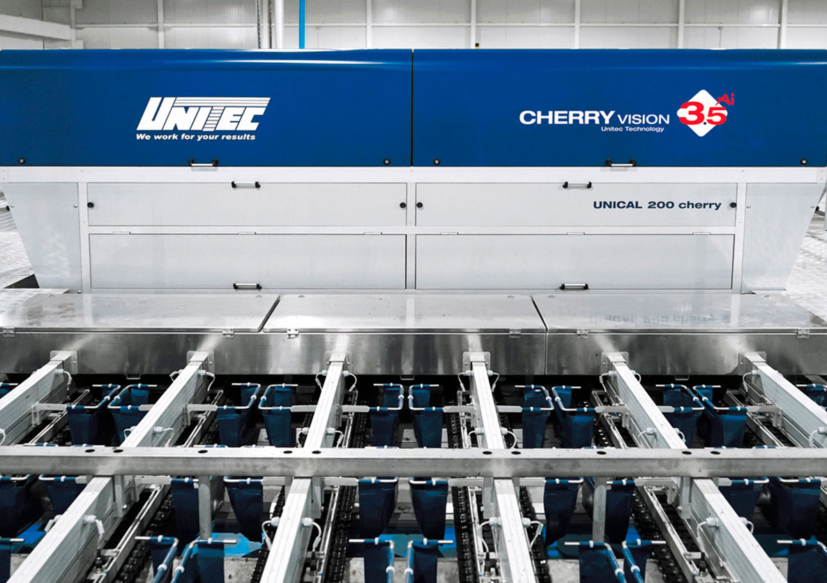 Svaki plod prolazi kroz Unitec Cherry Vision 3.5 AI: višekamerska inspekcija 360° procenjuje veličinu, boju, čvrstinu i uočava oštećenja, rezove i naprsnuća svake trešnje.